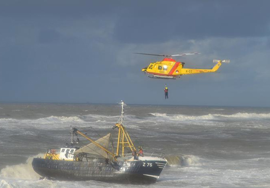 Last week an AB-412 SAR helicopter from Leeuwarden air base brought 3 crew members of a Belgian fishing boat to safety. The crew members were hoisted on board the helicopter using a rescue rope.On Wednesday night, the shrimp boat ‘Zeldenrust’ stranded on a breakwater on the coast near Petten in the province of Noord-Holland . The ship’s propeller had got caught in a fishnet, rendering her unmanageable. The AB-412 helicopters of Leeuwarden air base are on call for rescue operations 24/7. The aircraft are part of Defence Helicopter Command of the Royal Netherlands Air Force. Press Release, October 24, 2013; Image: Defensie |