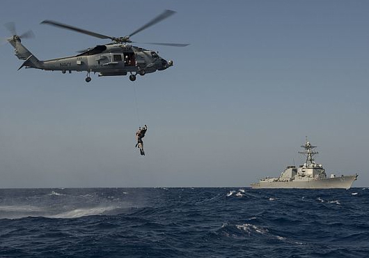 Surface rescue swimmers from guided-missile destroyer USS Mason (DDG 87) and aviation rescue swimmers from the Helicopter Maritime Strike Squadron (HSM) 74, “Swamp Foxes”, conducted a combined search and rescue (SAR) exercise in the Mediterranean Sea, Oct. 29.An MH-60R Seahawk helicopter from HSM 74 performed aerial searches and swimmer insertions while a rigid hull inflatable boat (RHIB) from Mason was used to deliver swimmers to recover simulated survivors more than two nautical miles from Mason.