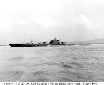 This photo shows USS Nautilus (SS-168) off the Mare Island Navy Yard, Calif., April 15,1942, following modernization.