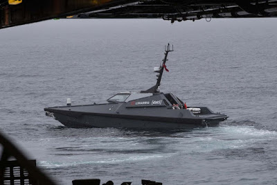 | Unmanned Surface Vessel MAST Maritime Autonomy Surface Testbed 13 during trails by British Royal Navy in Norway. (Picture source British Royal Navy) |