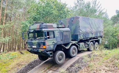 | When driving the Rheinmetall truck up a steep slope, the performance of the UTF must be completely convincing. The descent is slow and controlled (Picture source: Bundeswehr / Philipp Roßbach) |