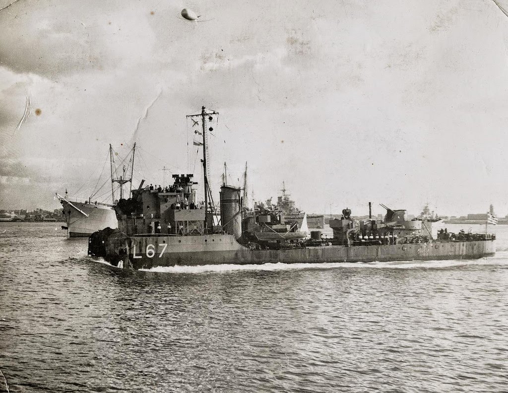 After the liberation of Greece from the Germans, Adrias, with her bow temporarily repaired, arrived in Faliro with the rest of the ships of the Hellenic Fleet. The ship was never fully repaired due to the termination of war operations in the Mediterranean and sailed to England where she was returned to the Royal Navy. Of the same class of ships serving in the Hellenic Navy were: Adrias (D06) formerly HMS Tanatside (loaned to Hellenic Navy as a replacement of this ship), Hastings formerly HMS Catterick loaned to Hellenic Navy in 1946, Kanaris built as HMS Hatherleigh, Miaoulis built as HMS Modbury, Pindos built as HMS Bolebroke.