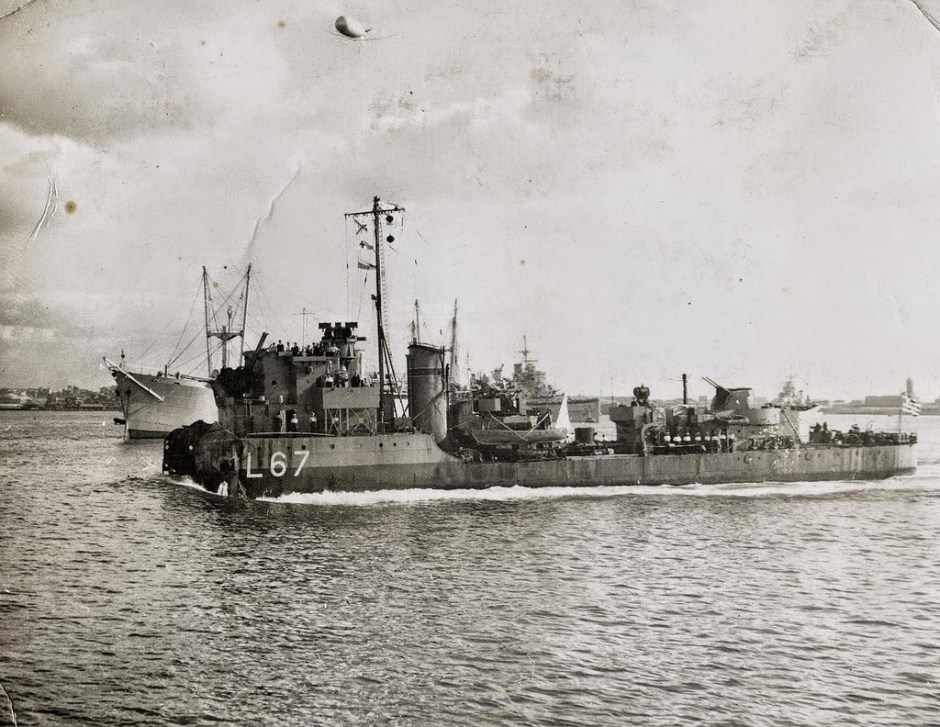 On 22 October 1943, during operations in the Dodecanese, while near the island of Kalymnos with the British destroyer HMS Hurworth, Adrias struck a mine. The explosion tore her bow off. The English Flotilla Commander onboard Hurworth ordered Cmdr. Toumbas to abandon ship. Hurworth, while trying to come to Adrias’s rescue, also hit a mine and sunk taking 143 men with her. In spite of the damage suffered, Adrias took on the survivors of Hurworth (among them her CO) and managed to reach the nearby coast of Gümüşlük in neutral Turkey with 21 men of her crew dead and 30 wounded. After some minor repairs, the ship sailed on 1 December for Alexandria, despite her missing bow. After a trip of 730 nautical miles (1,350 km), of which 300 were within the range of Luftwaffe’s Junkers Ju 88 bombers based in occupied Greece, (the threat of them forced her to sail only at night despite her limited maneuverability), she managed to reach Alexandria on 6 December (day of the Feast of St. Nicholas, patron saint of seamen) where she was enthusiastically greeted by the British Fleet and other Allied ships. This achievement was considered a brilliant example of seamanship, and provided a morale boost to the Royal Hellenic Navy and other allied ships in the Mediterranean.