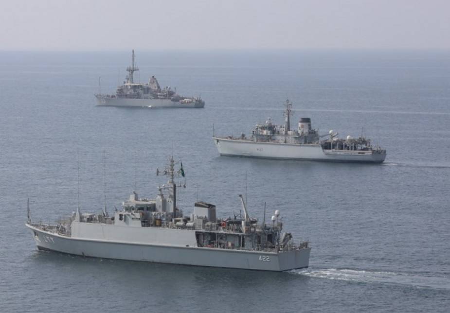 | Royal Saudi Naval Force mine countermeasures vessel Al-Shaqra (MCMV 422), front, Royal Navy mine countermeasures vessel HMS Brocklesby (M 33), middle, and mine countermeasure ship USS Dextrous (MCM 13) sail in formation during mine countermeasures interoperability training, led by Commander, Task Force (CTF) 52 in the Arabian Gulf, Nov. 11 (Picture source: U.S Army/Spc. William Gore) |