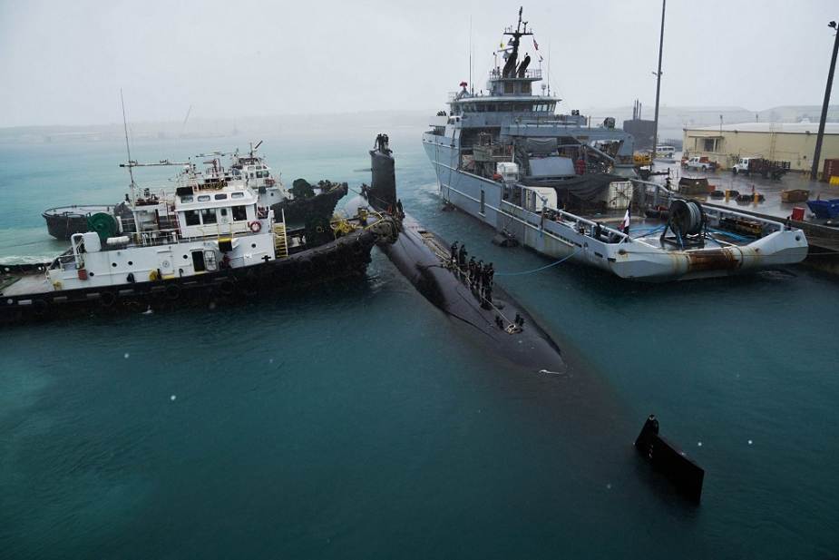 | Naval Base Guam tug boats assist as the French Navy Rubis-class attack submarine FS Émeraude S604 moors against the French Navy Loire-class tender and support vessel FS Seine A604 at U.S. Naval Base Guam NBG. (Picture source U.S. Navy) |