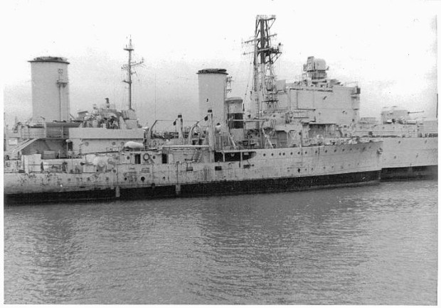 | HMNZS Royalist and HMNZS Stawell being readied for scrapping. Royalist towed to Japan – Stawell was sold to Pacific Scrap Limited of Auckland, New Zealand in July 1968, and was broken up for scrap |