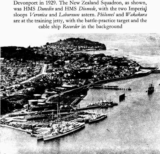 | Devonport in 1929. The New Zealand Squadron, as shown, was HMS Dunedin and HMS Diomede, with the two Imperial sloops Veronica and Laburnum astern. Philomel and Wakakura are at the training jetty, with the battle-practice target and the cable ship Recorder in the background |