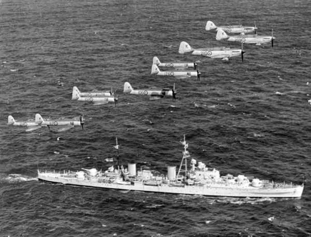 6481. Another view of the Commonwealth Jubilee Exercises off the coast of Tasmania in Feb.-March 1951. Here we see a flight of 10 aircraft – seven Hawker Sea Furies and three Fairey Fireflies from HMAS SYDN EY over the 5,950-7,200 ton [full load] New Zealand Modified Dido Class cruiser HMNZS BELLONA.