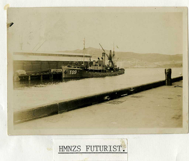 HMNZS Futurist – Futurist was built as the German minesweeper, Papenburgh in WW1, surrendered in 1920, sold and in use as a Napier trawler. She had been nominated for requisition and was already fitted with basic minesweeping gear whilst still fishing in April 1940. On 20 June 1940, the day after the sinking of the liner Niagara, she was requisitioned and commissioned for permanent service as a minesweeper.,