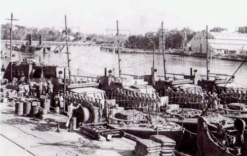 | Bow of Phyllis (T22) seen just astern of the Fairmiles |