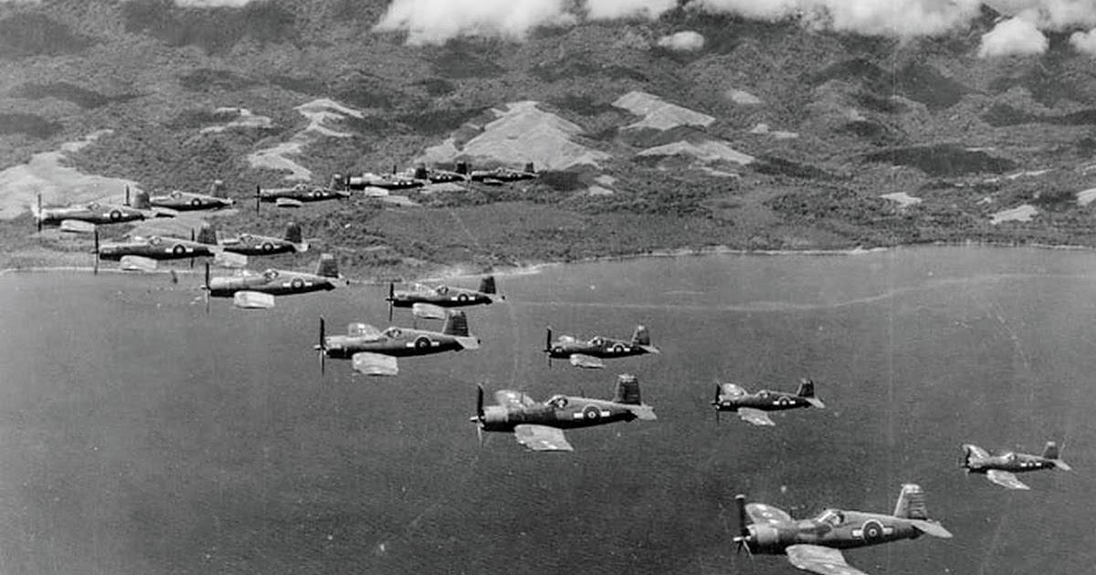 The Royal New Zealand Air Force made a significant contribution to the Pacific War in the Solomon Islands. Beginning with bomber reconnaissance operations in November 1942, their involvement expanded considerably. Here New Zealand Corsair fighter planes fly just off the coast of Guadalcanal in 1944.