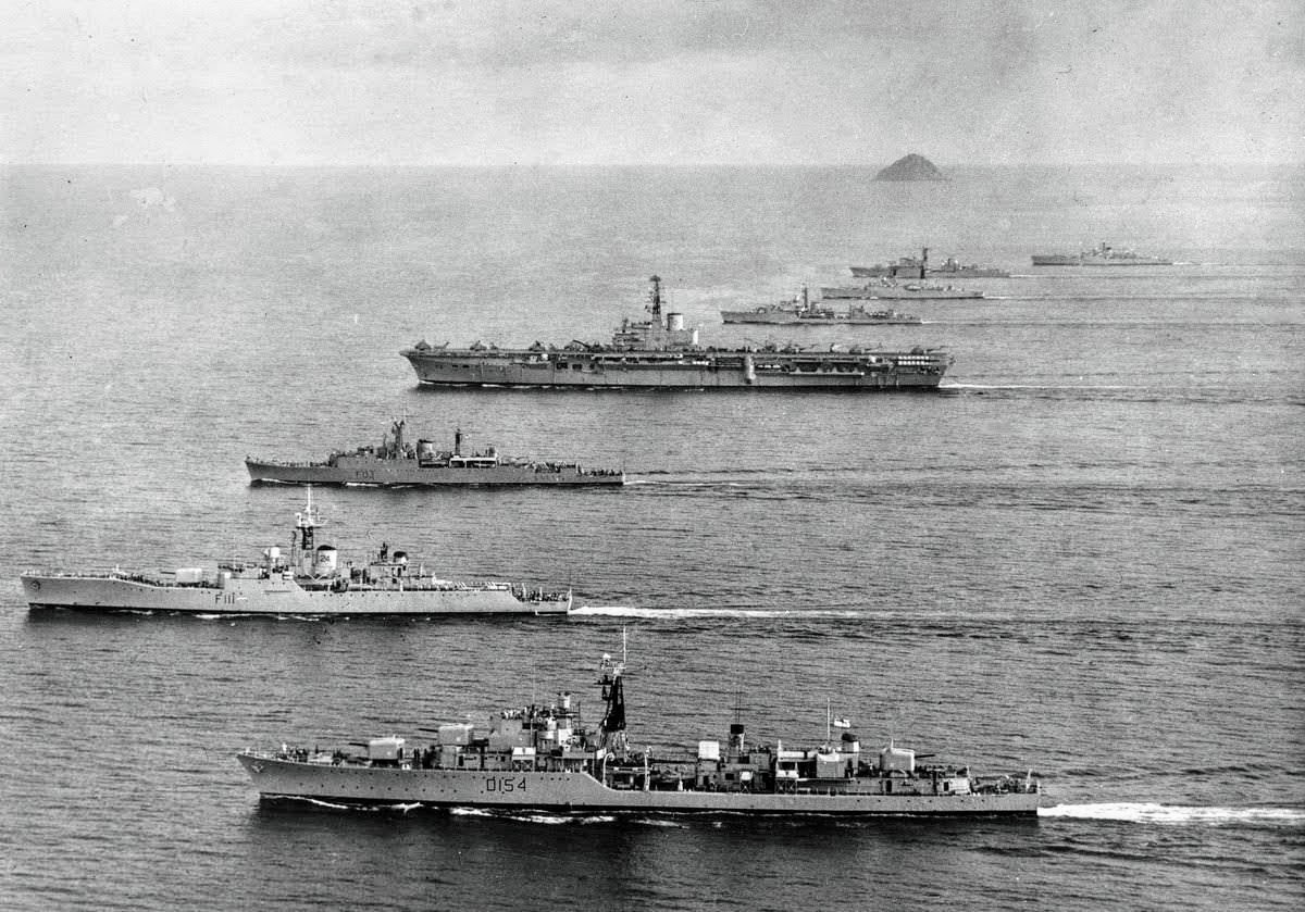 HMS Plymouth (F126), HMAS Vendetta (D08), HMS Salisbury (F32), HMS Cambrian (D85), HMS Albion (R07), HMAS Quiberon (F03), HMNZS Otago (F111) and HMS Duchess (D154), Malaya, 1963 – Near Pulau Tioman, Pulau Aur in background
