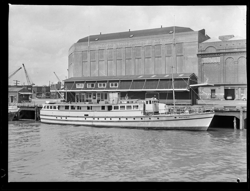 This is the Waiheke ferry Motunui, 6 November 1956, in a NZ Herald image (1370-122-8, Sir George Grey Special Collections, Auckland Libraries). One with a strange fate … Last Port of Call – The Strange Fate of Fairmile 406Monday, November 3rd, 2014 July 5th, 2006, Tauranga Harbour, New Zealand. The long slender hull of a World War II submarine chaser is hoisted by a pair of cranes and hangs, blackened by mildew and marine growth, raining putrid bilge water onto the dockside. Hours later, settled upon a monstrous steerable trailer, she was ready to begin the 150km (94 mile) two day journey inland to her final destination in Waitomo for conversion to a novelty motel unit. So ended the seagoing career of ML406, naval patrol boat and long-time Auckland ferry. Design and Construction At the outbreak of the second world war, the Royal New Zealand Navy relied entirely on requisitioned private motor boats for coastal patrol, harbour defence and minesweeping activities. However, these were mostly small, slow, inadequately armed, and of very limited threat to the enemy. To defend our ports from the perceived threat of Japanese submarine attacks it was considered vital that fast, purpose-built craft be commissioned, and after much consideration the British Fairmile B design was chosen. Among its advantages was its kitset construction, whereby frames and bulkheads could be prefabricated by furniture makers, or any other commercial woodworking firms, and shipped anywhere in the world to be completed by local boatbuilders. Once the frames were erected on the slipways, planking would be done using local timbers. This enabled the boats to be constructed quickly and easily, requiring fewer skilled labourers, as these were in short supply. July 1943, Waitemata Harbour, Auckland. Sea trials completed, ML406 is commissioned into service in the RNZN. One of twelve identical boats built in Auckland (numbered ML 400-411), she had just been completed by Associated Boatbuilders using the world’s finest boatbuilding wood – native New Zealand kauri. Fitted with a pair of V12 Hall-Scott Defender petrol engines, the narrow 112 foot boat could achieve 20 knots (37km/h) flat out, and was fitted with guns fore and aft, twelve depth charges and an ASDIC sonar device. Crews consisted of sixteen sailors. The image of these craft patrolling in formation, v12’s at full stink, peaked caps visible on the exposed bridge, all weapons manned and Rangitoto Island in the background, is still a stirring one. Naval Service Once all twelve boats were launched and commissioned the fleet was divided into two flotillas, 80th and 81st, with the 81st flotilla initially sent south to Wellington to protect the Cook Strait and port approaches. Being part of the 80th flotilla, ML406 remained Auckland-based, patrolling coastline as far north as Whangerei. Unfortunately, due to bureaucratic delays and material shortages, by the time the Fairmile building program was completed the likelihood of submarine attacks seemed to have passed. This realisation led to Admiral Halsey, US commander of the South Pacific Allied Forces, ordering both flotillas to make passage to Renard Sound in the Solomon Islands, where they would serve under the command of the US Navy, performing anti-submarine patrols and relieving American destroyers and patrol craft for other duties. In early 1944 all ships and crew were urgently outfitted for service in tropical climates, and ML406 was in the first batch of boats to leave New Zealand. On February 7th, 1944, she and four other Fairmiles departed Auckland on what was to prove a punishing journey, with a final farewell and refuel at Whangaroa Harbour, then on to Norfolk Island, Noumea, and Espiritu Santo, before finally reaching Renard Sound in the Russell Islands on March 9th. Patrols went without enemy contact for the sixteen months the boats were stationed in the Solomons, however the crews were kept busy with the great deal of maintenance required of these light, fast vessels. Minor accidents such as stranding on reefs were recorded by some Fairmiles, and there was always the extreme danger of petrol explosions, but all the NZ boats lived out the war relatively unharmed. Returning to Auckland in July 1945, the fleet of “little ships” was decommissioned and mothballed on moorings at Greenhithe (then called Pine Island) in the upper reaches of the Waitemata Harbour. All eventually had their V12 engines removed, and all but one (ML411) were sold off in 1946-47 by the War Assets Realisation Board. Motunui Offered up for tender in October 1946, ML 406 was purchased by Dunedin car dealer, auctioneer, and entrepreneur Rodney Farry, who fitted twin Graymarine 6-71 diesels and converted her into a passenger vessel. Modestly christening her Rodney Farry, she operated chartered cruises around Otago Harbour until she ran aground on a sandbar, causing Rodney Farry the first to lose interest in the concept. Re-named New Venture in 1949, she was steamed back up to Auckland in a near tragic voyage. Under the command of a temporary crew, she struck a violent storm off the Castlecliff Coast, near Whanganui. Rather than heading out to sea, the terrified and inexperienced sailors chose to hug the coastline, with very nearly fatal consequences for both men and ship. Re-named yet again in 1950, this time as Motunui, she was acquired by the Waiheke Shipping Co. and set to work as a passenger ferry from Waiheke Island to downtown Auckland ferry terminal, plus fishing excursions around the Hauraki Gulf. In February 1965 Waiheke Shipping, with assets including the ferries Motunui and Baroona, was bought by North Shore Ferries Ltd., and following a refit the Motunui continued its daily trudge from Auckland to Waiheke Island, blending in with the other workhorses on the Waitemata. Thirty-something years of service as an Auckland ferry finally ended when North Shore Ferries sold her into private ownership in 1984. As with many boats o
