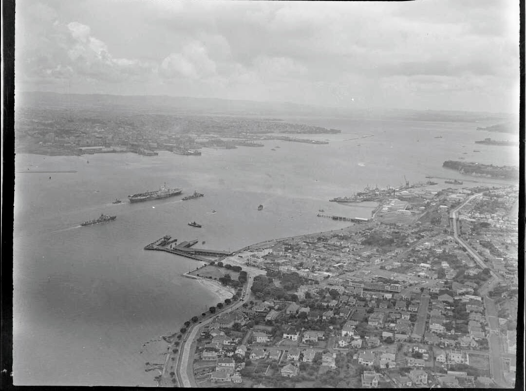 HMS Indefatigable, Auckland Harbour. Whites Aviation Ltd: Photographs. Ref: WA-01691-F. Alexander Turnbull Library, Wellington, New Zealand. /records/30645476