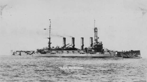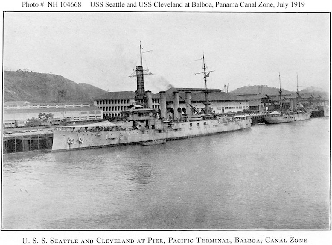 | USS Seattle (Armored Cruiser No. 11) at the Panama Canal’s Pacific terminal, Balboa, Panama Canal Zone, circa July 1919. USS Cleveland (Cruiser No. 19) is beyond Seattle’s stern, at right. The original halftone image is included in the booklet “The New Pacific Fleet Through the Panama Canal, July 1919, published by the Panama Pictorial Company, Newark, New Jersey. |