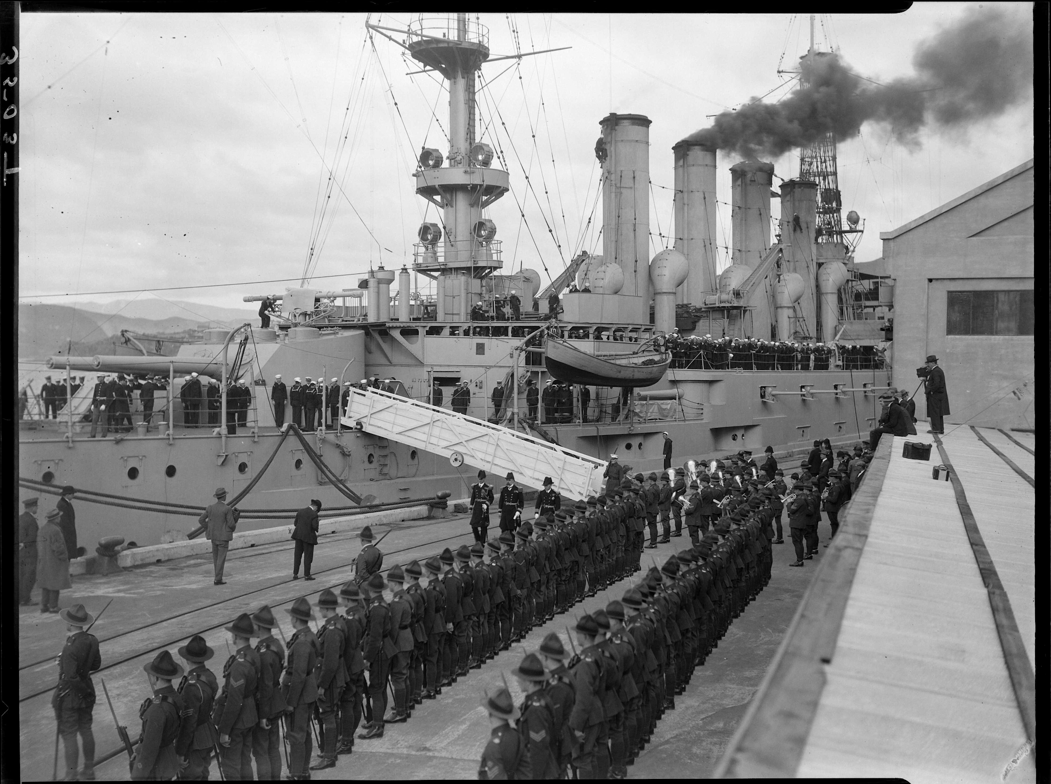 The armoured cruiser USS Seattle at Pipitea Wharf during a 1925 visit to Wellington, New Zealand.