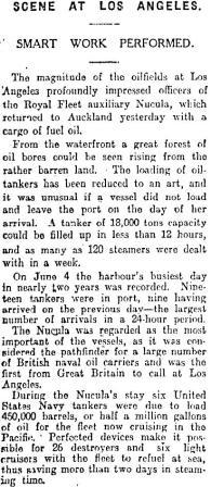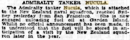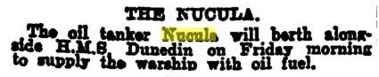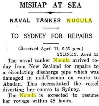 17 April 1937 at Auckland, New Zealand while going alongside HMAS SYDNEY to refuel her she was caught heavily by a rip tide and hit the cruiser causing damage to HMAS SYDNEY’s port side propeller and forcing her into the wharf causing further damage to her quaterdeck. Nucula was not damaged.