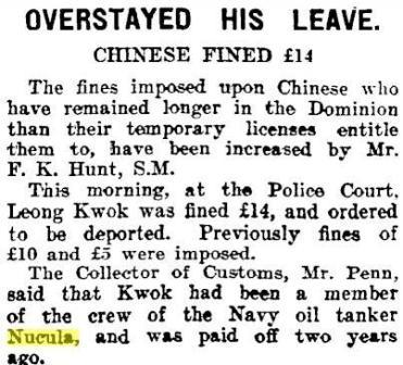 September 1924 a wooden chest the property of a member of the crew was stolen from the ship while it was berthed at the Sheerlegs Wharf, Devonport, Auckland. The chest was found floating in the harbour with part of its contents missing