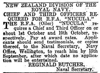 31 July 1936 the New Zealand Division of the Royal Navy advertised in the New Zealand Evening Post for a Chief Officer and a Third Officer