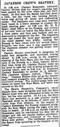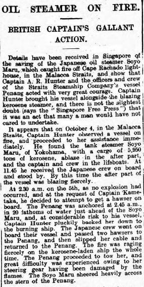 8 October 1912 suffered an engine room fire in the Malacca Straits about 160 miles north of Singapore. The cargo, passengers and crew were safe – reported in the Hong Kong Telegraph of 11 October 1912
