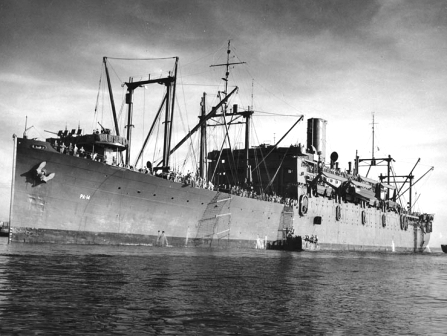 31 May 1943 at Queens Wharf, Auckland, New Zealand USS Hunter Liggett (APA14) alongside to refuel – supplied with 5,129 barrels of fuel oil