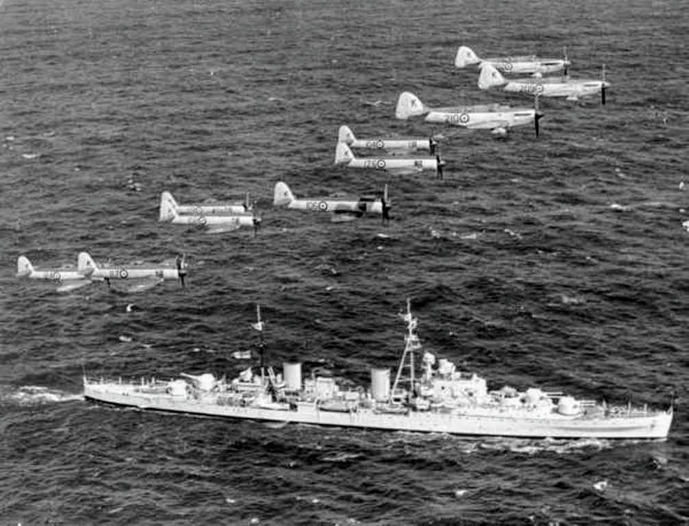 - Another view of the Commonwealth Jubilee Exercises off the coast of Tasmania in Feb.-March 1951. Here we see a flight of 10 aircraft – seven Hawker Sea Furies and three Fairey Fireflies from HMAS SYDN EY over the 5,950-7,200 ton New Zealand Modified Dido Class cruiser HMNZS BELLONA.