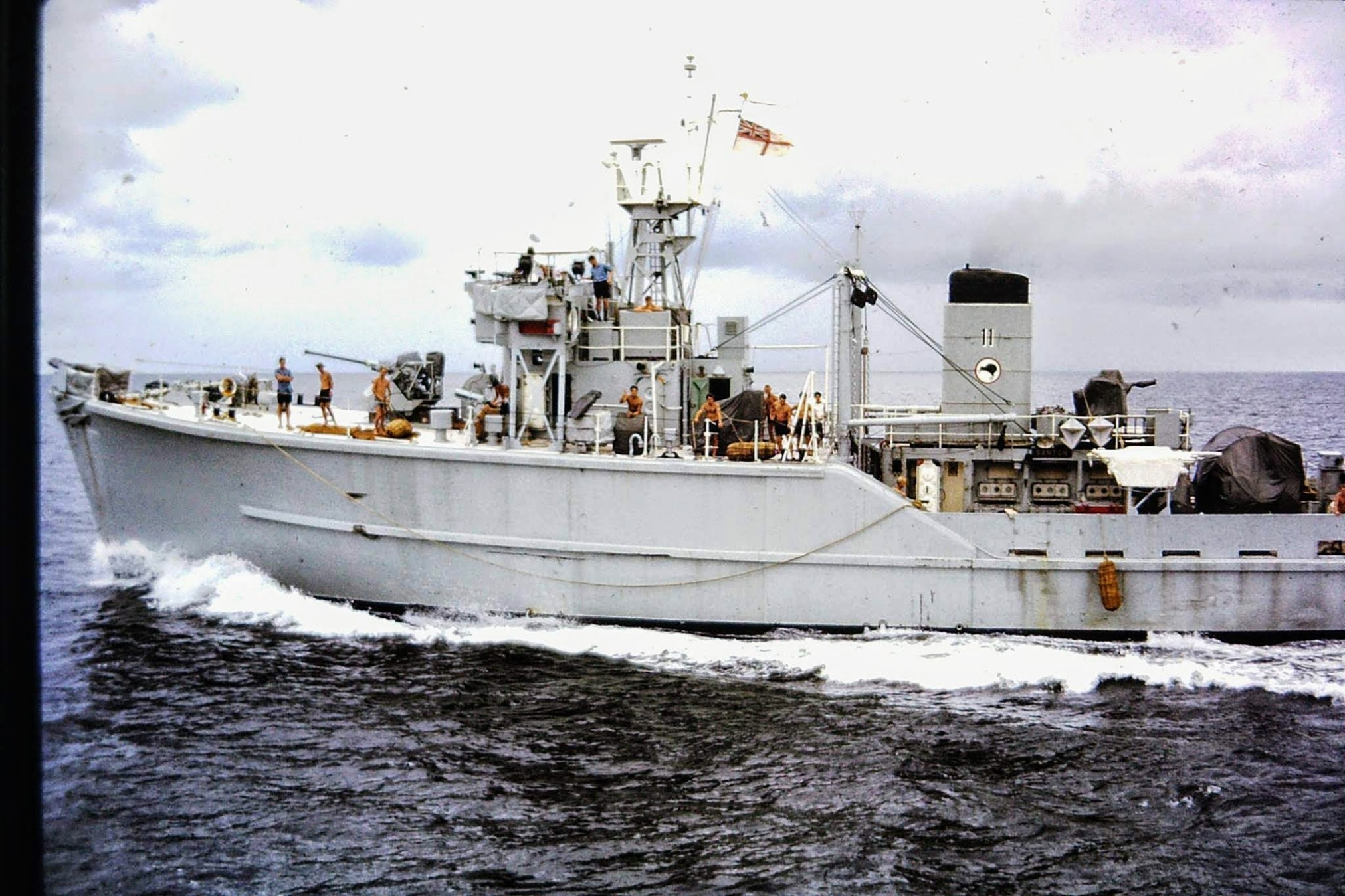 Early in 1965, Indonesia was employing a policy of confrontation against Malaysia. New Zealand agreed to assist Malaysia by deploying two Royal Navy minesweepers then in reserve at Singapore. These were commissioned into the RNZN on 10 April 1965 and joined the Royal Navy’s 11th Minesweeping squadron (also Ton class), taking part in anti-infiltration patrols in Malaysian waters. Lieutenant Lincoln Tempero, later Chief of Naval Staff, was appointed Commanding Officer.[1] Tempero was promoted to Lieutenant-Commander on 16 February 1966, and suffered a hard head that evening![2]