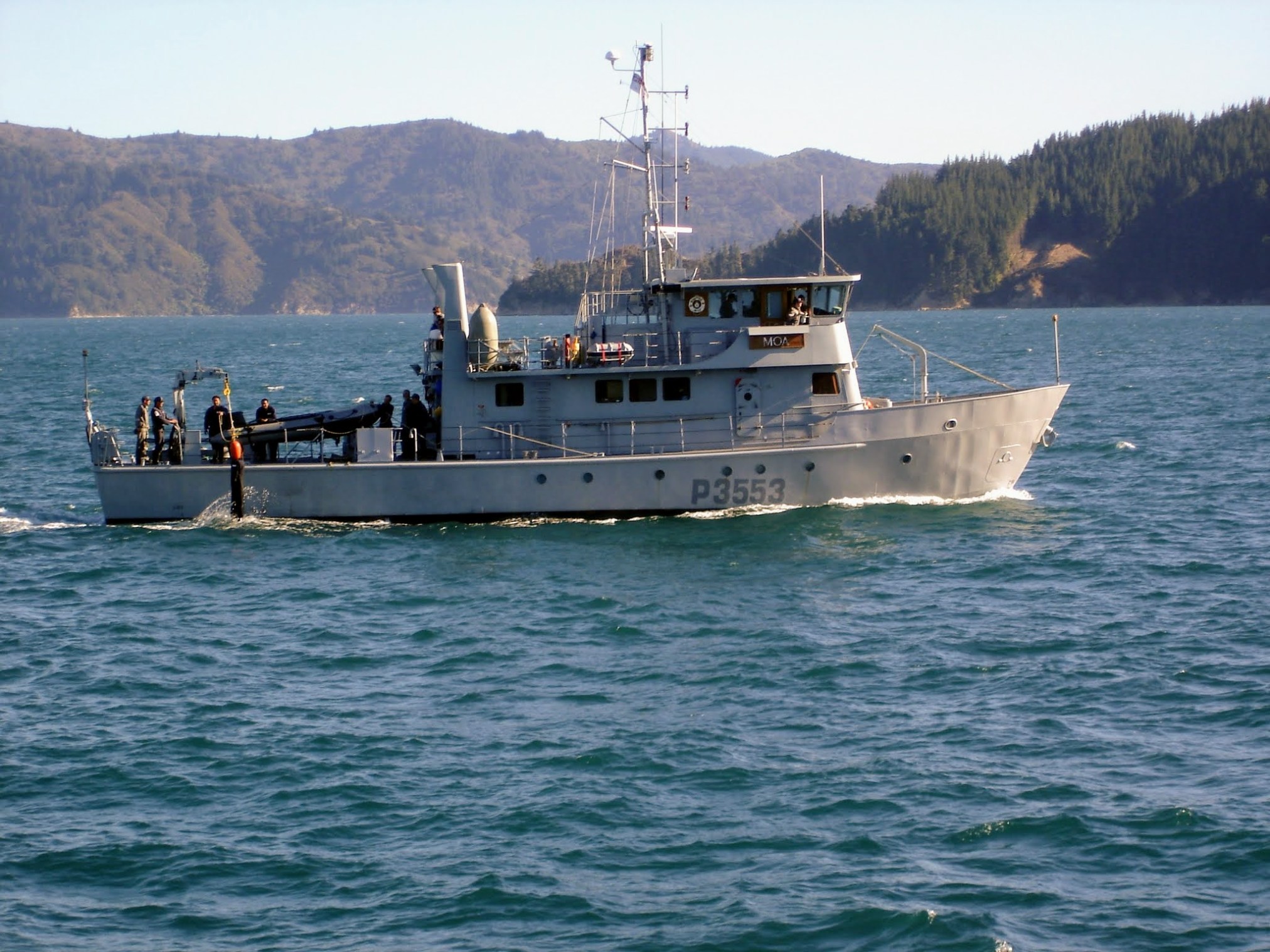 Kahu was distinguished from other boats of the Moa class by the gantry on her quarterdeck and lack of funnels.