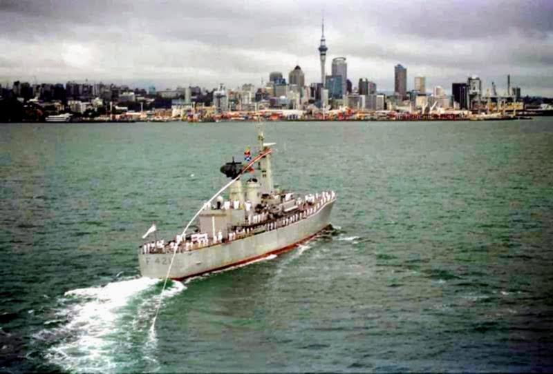 She undertook operations such as supporting UN sanctions against Iraq and peace-keeping in East Timor. With her sister ship HMNZS Waikato she relieved the Royal Navy frigate HMS Amazon in the Indian Ocean during the Falklands War. Early in HMNZS Canterbury’s career, in 1973, she relieved the frigate HMNZS Otago, as part of a unique, Anzac, naval operation or exercise at Moruroa during anti-nuclear protests, supported by a large RAN tanker, providing fuel and a large platform for Australian media. This was due to F 421 being a more modern RNZN frigate, with then current Rn surveillance radar and ESM and a more effectively insulated frigate from nuclear fallout, with the Improved Broad Beam Leander steam plant, for example, being remote controlled and capable of unmanned operation and therefore the ship provided a more effective sealed citadel for operations in areas of nuclear explosions.