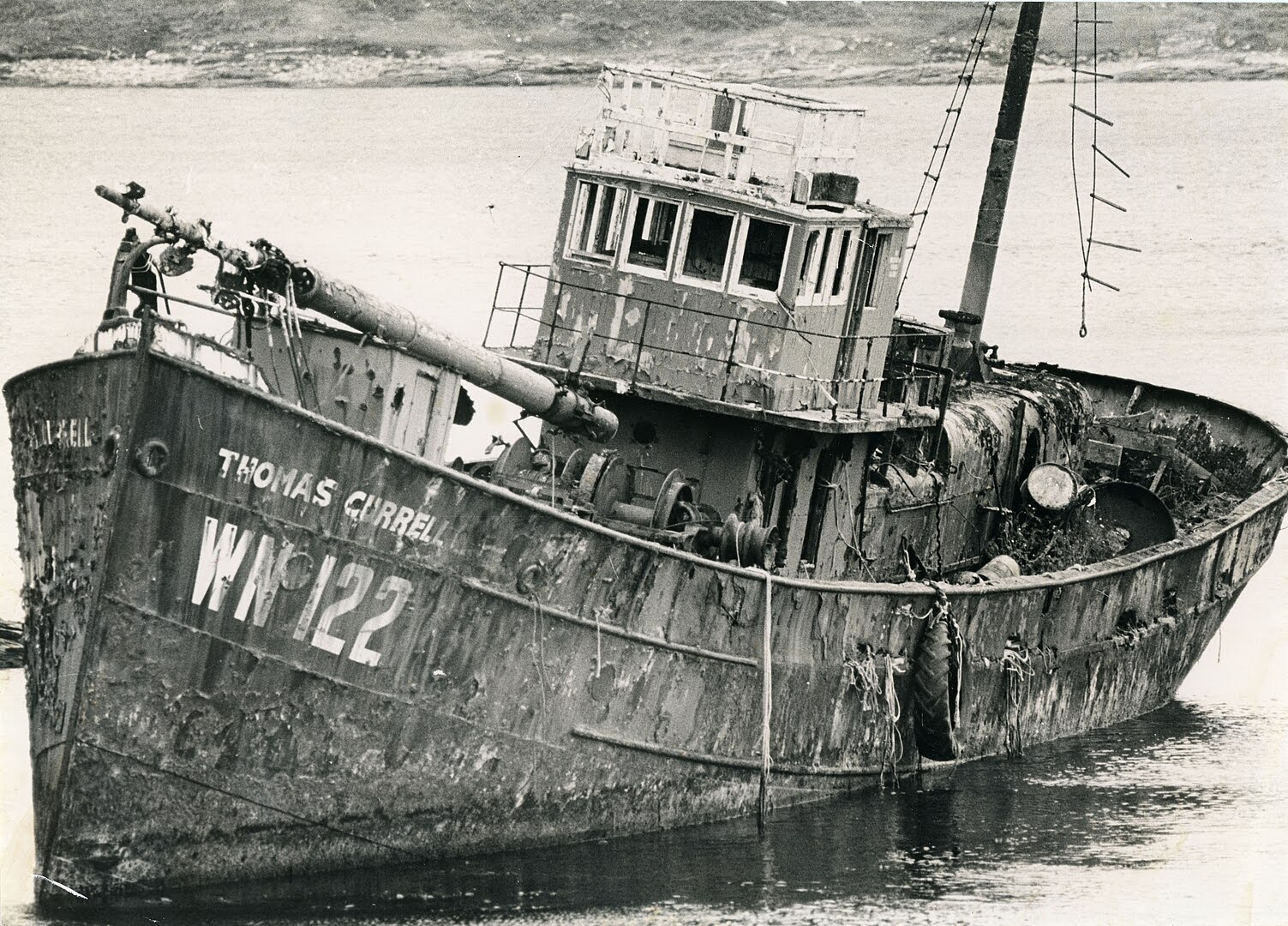 In 1955, the Thomas Currell was re-engined as her current boiler was becoming more expensive to operate.[7] A 480 brake horsepower (360 kW) diesel engine was installed, with additional ballast needed due to a 20-ton difference in weight between her old engine and her new engine. The cost of this refit would cost £20,000 in total.[7] In the late 1950s, the company who owned the Thomas Currell would go out of business, and she would be put up for sale.[7] She would be sold to the Wellington Trawler Company.[7] In 1966, during the Chatham Islands crayfish boom, the Thomas Currell would be moved to Port Hutt to act as a floating freezer to store crayfish, which the Holmdale would take to mainland New Zealand.[8] She would be maintained by Jimmy Lenagham, who had been the chief engineer on her voyage to Port Hutt. While she was moored, she would occasionally break free from her moorings, hitting other ships.[8] This caused Lenagham considerable anxiety so in 1968, he decided to rid himself of the problem and would run the Thomas Currell ashore at full speed at Port Hutt.[8] She remains there to this day.