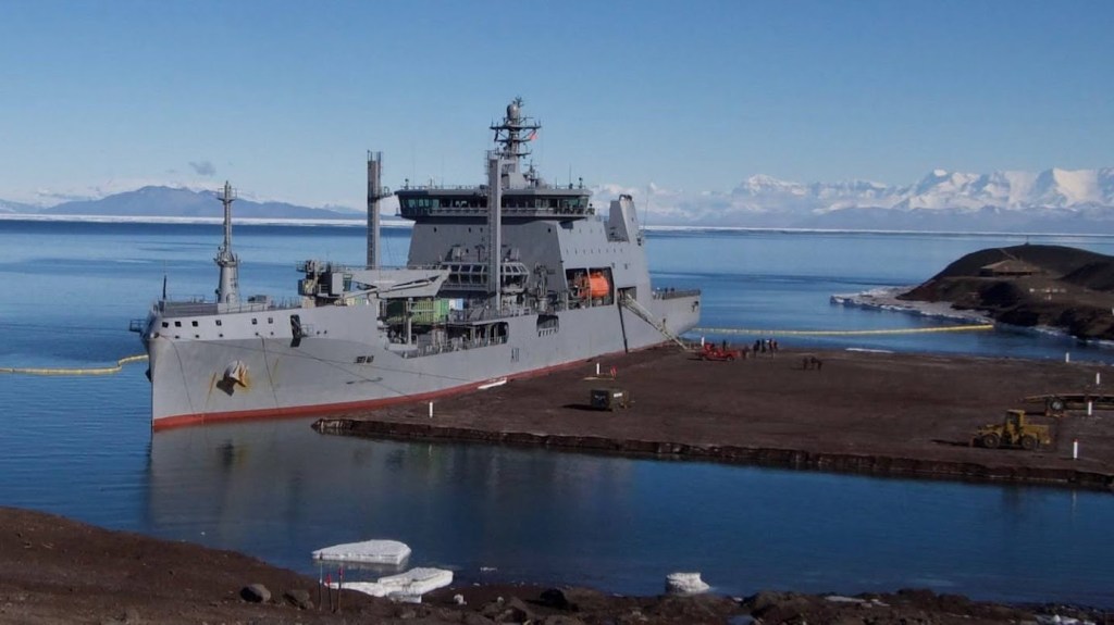 Feb13, 2022 NZ Navy polar-class logistics support vessel HMNZS Aotearoa has arrived at the McMurdo Station ice pier on its maiden voyage to #Antarctica. The Royal Society Range is visible on the far side of McMurdo Sound.Royal New Zealand Navy, Antarctica New Zealand photo: Alex Brett