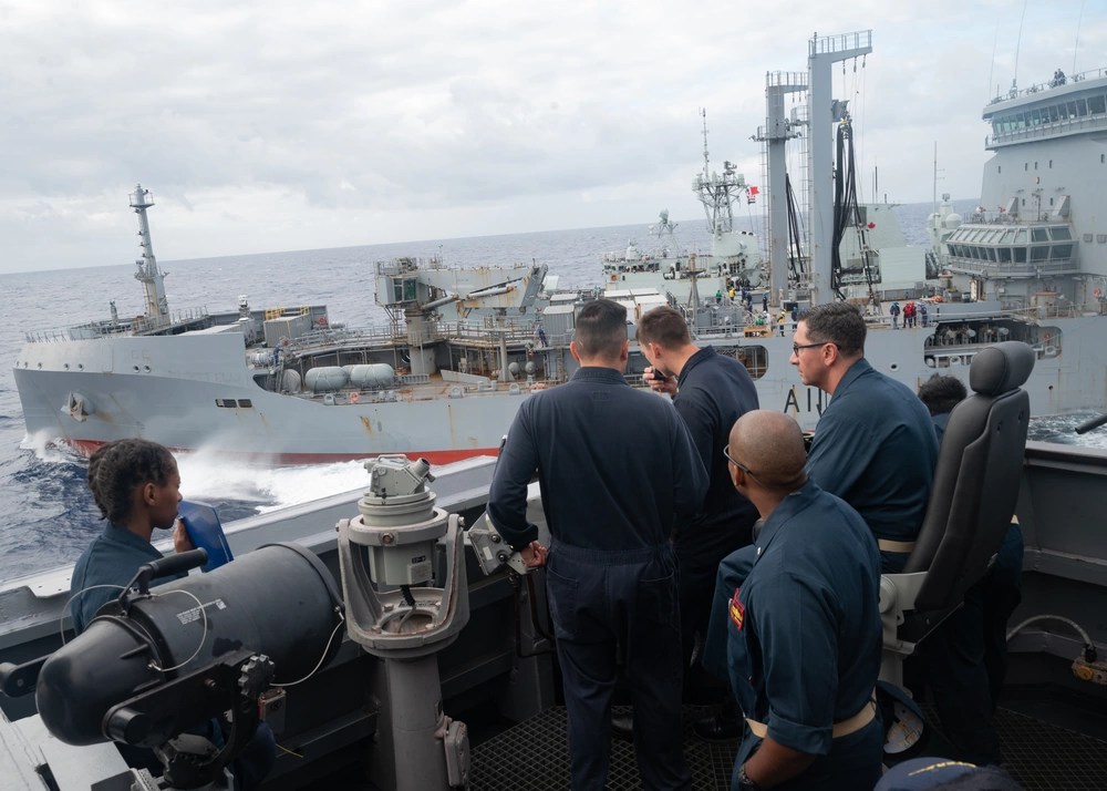 Sailors aboard Arleigh Burke-class guided-missile destroyer USS Sterett (DDG 104) heave a line during a replenishment-at-sea with Royal New Zealand Navy auxiliary oiler replenishment ship HMNZS Aotearoa (A 11) during Rim of the Pacific (RIMPAC) 2024 in the Pacific Ocean, July 13. Twenty-nine nations, 40 surface ships, three submarines, 14 national land forces, more than 150 aircraft and 25,000 personnel are participating in RIMPAC in and around the Hawaiian Islands, June 27 to Aug. 1. The world’s largest international maritime exercise, RIMPAC provides a unique training opportunity while fostering and sustaining cooperative relationships among participants critical to ensuring the safety of sea lanes and security on the world’s oceans. RIMPAC 2024 is the 29th exercise in the series that began in 1971. (U.S. Navy photo by Mass Communication Specialist 1st Class R. Ezekiel Duran)