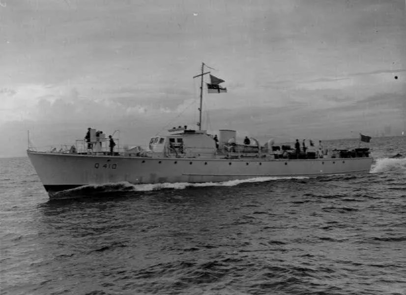 Description An original black and white photograph of Fairmile Q410 just after being launched at P Vos Ltd’s shipyard on 10 December 1942. Q410 was commissioned on 25 January 1943. The masts of the scow ECHO are in the background. In the centre is a starboard view of a small ship with a flag flying from a mast above the cabin that looks like the Union Jack. Another flag is hung at the bow which could be the New Zealand flag. Three men are standing at the bow, two are in uniform. There are several buildings in the background to the left. One has Waitemata Fisheries Ltd written on two sides. Above the ship’s cabin two masts are visible. On the reverse of the mount is a caption written in black pen by Jack Churchouse. Auckland, 10 Dec 1942