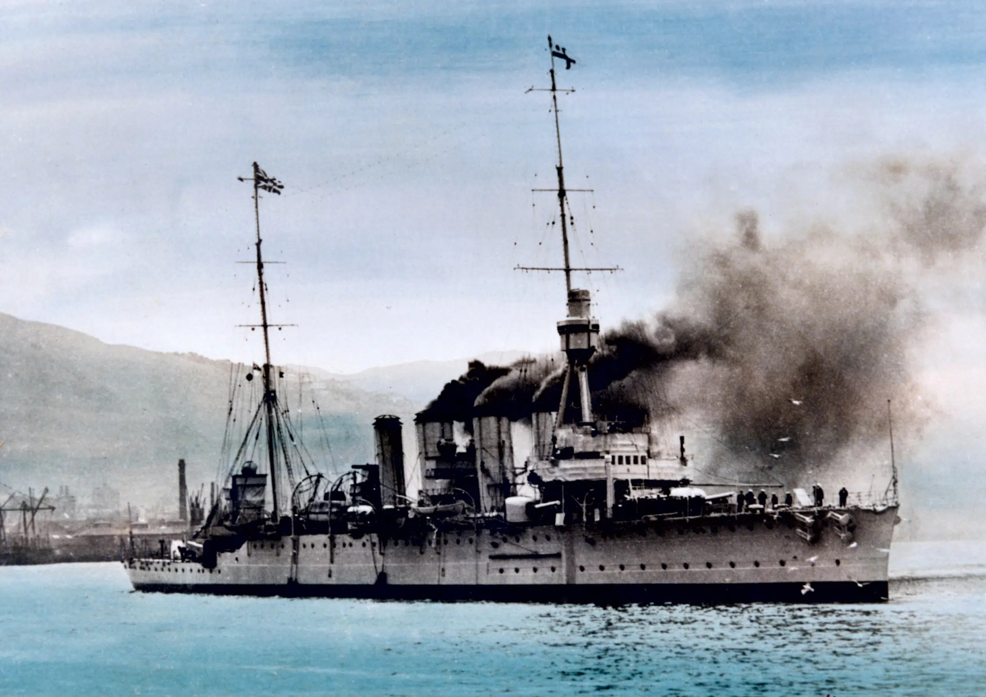 At the outbreak of WW I Chatham was part of the Light Cruiser Squadron based in the Mediterranean. After service in the Red Sea she discovered the whereabouts of the German cruiser Konigsberg, up the Rufiji River in November 1914 and sank that ship’s attendant colliers to prevent its escape. She also captured a German merchant ship at this time. In May 1915 Chatham was employed in the Dardanelles campaign and was remembered by many New Zealand soldiers for this service. From 1916-18 Chatham was flagship of the 301 Light Cruiser Squadron with the Grand Fleet but was damaged by a mine on 26 May 1916, so missed the Battle of Jutland. After the Armistice the ship was placed in reserve until recommissioned for New Zealand.