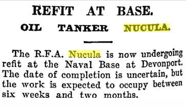 With the change from coal powered to oil-fired warships the New Zealand Division (hereafter NZDiv) of the Royal Navy required replenishment support for its new cruisers HMS Diomede and Dunedin. With the imminent arrival of HMS Dunedin on station in 1924 the New Zealand Government negotiated for an oiler to enable navy controlled supplies of fuel oil. On 27 May 1924 RFA Nucula was transferred to NZDiv control as a Fleet Attendant oiler and hired by the New Zealand government. The formal handover took place at Suva where she had stopped on a voyage from Singapore to Auckland. RFA Nucula arrived at Auckland on 5 June 1924. Due to her design, she could not undertake replenishments at sea or underway oiling. She would act as a supply ship for the sloops HMS Wellington and Leith along with the two cruisers. When they would depart on the island cruises, a feature of the interwar period in the South Pacific, Nucula would refuel the vessels in sheltered ports and anchorages.