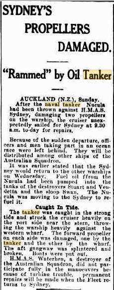 17 April 1937 at Auckland, New Zealand while going alongside HMAS SYDNEY to refuel her she was caught heavily by a rip tide and hit the cruiser causing damage to HMAS SYDNEY’s port side propeller and forcing her into the wharf causing further damage to her quaterdeck. Nucula was not damaged.