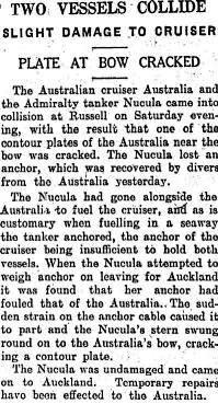 26 August 1933 in collision with HMAS AUSTRALIA and lost an anchor while alongside the cruiser refuelling her at Russell. The anchor was recovered by divers and the Nucula suffered no damage. HMAS AUSTRALIA suffered hull damage which required dockyard repairs