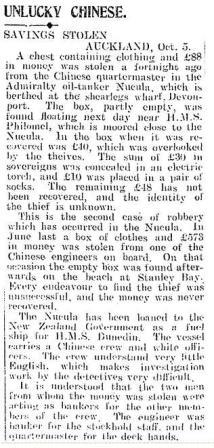 September 1924 a wooden chest the property of a member of the crew was stolen from the ship while it was berthed at the Sheerlegs Wharf, Devonport, Auckland. The chest was found floating in the harbour with part of its contents missing