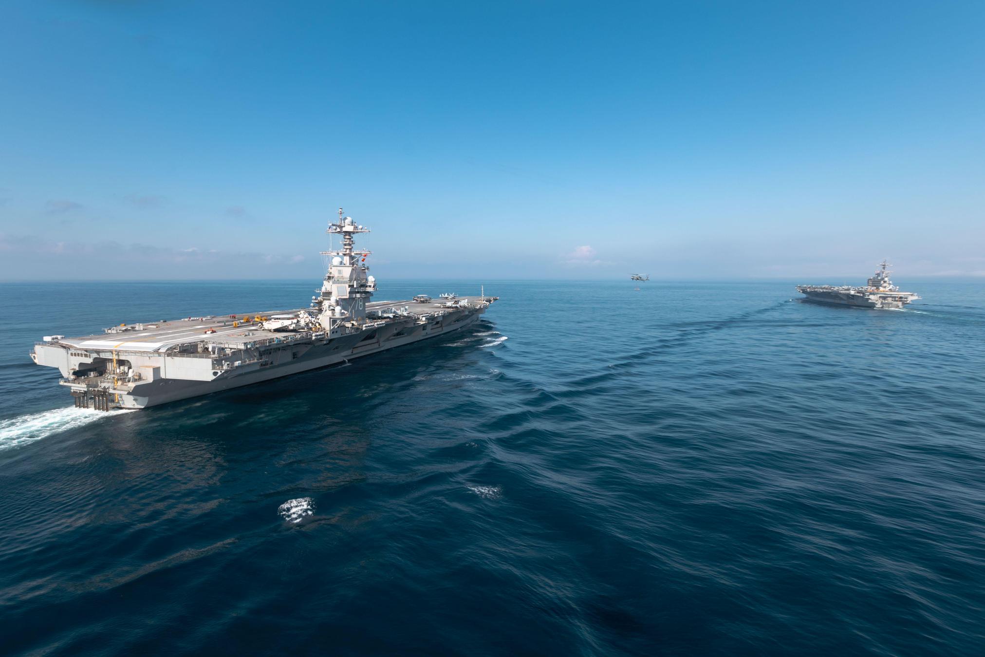 First of the Ford class, last of the Nimitz class. USS Gerald R. Ford (CVN 78) conducts a vertical replenishment with USS George H.W. Bush (CVN 77). Atlantic Ocean, June 27, 2025