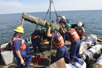 Blackbeard’s Cannons Salved MarineLink.com Tuesday, October 29, 2013 Blackbeard’s cannons lifted: Photo courtesy of USCG The crew of the Coast Guard Cutter ‘Smilax’ worked with personnel from the North Carolina Department of Cultural Resources to recover 5 cannons and multiple barrel hoops from the ‘Queen Anne’s Revenge’ in Beaufort Inlet, N.C. The Queen Anne’sContinue reading “Blackbeard’s Cannons Salved”