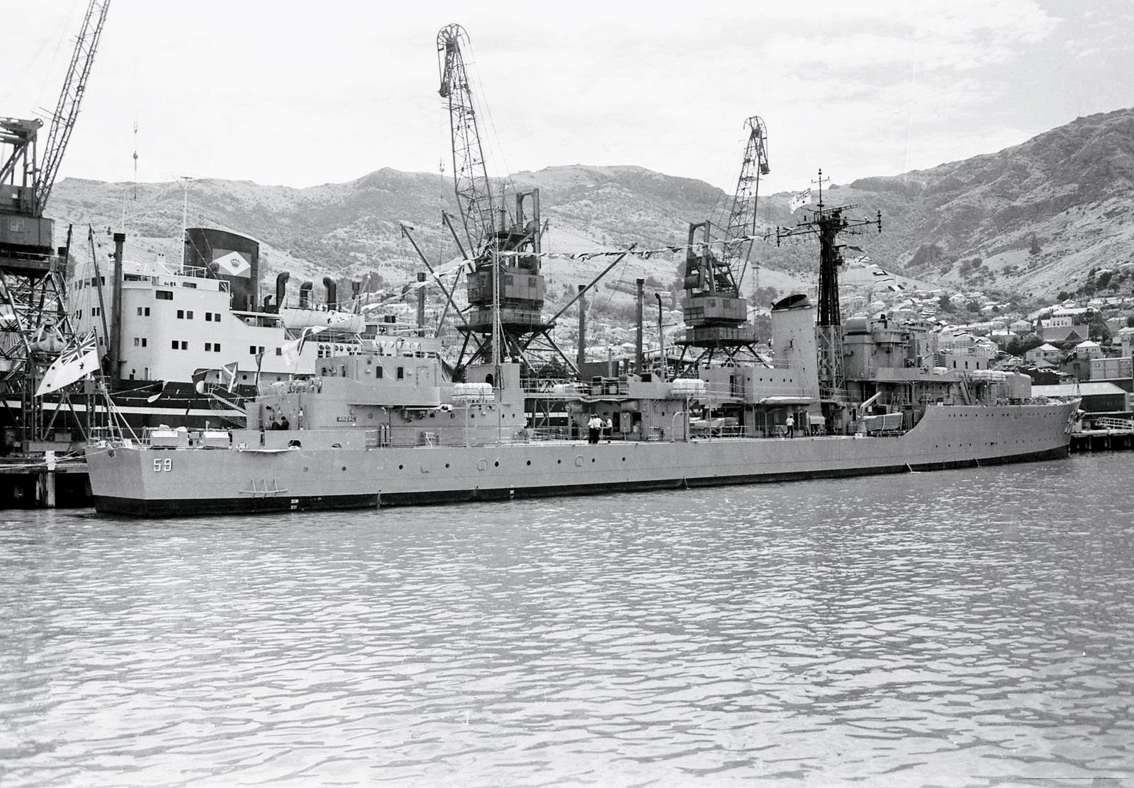 HMAS ANZAC Lyttleton 1974 – HMAS Anzac (D59) was a Battle-class destroyer of the Royal Australian Navy (RAN). Named after the Australian and New Zealand Army Corps, the destroyer was commissioned in 1951. The ship served on two tours of duty during the Korean War, and attempts to distinguish herself from British ships led to the practice of red kangaroo symbols on Australian warships. During 1956, Anzac served during the Malayan Emergency. In 1960, a malfunction in the destroyer’s gun direction equipment caused Anzac to fire directly on sister ship HMAS Tobruk during a gunnery exercise, with Tobruk left unrepairable. In 1961, the destroyer was reclassified as a training vessel. Anzac remained in service until 1974, and was sold for breaking a year later.https://en.wikipedia.org/wiki/HMAS_Anzac_(D59)